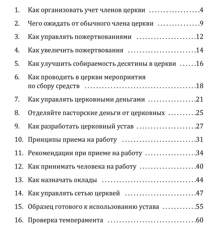 Эту книгу бесспорно можно назвать уникальной, потому что молодые пастора, служители церкви, и даже пастора со стажем найдут в ней то, о чем, как правило, умалчивается. Чего ожидать от членов церкви; как управлять церковными деньгами; как проводить сбор средств; как осуществлять учет членов церкви — эти и другие вопросы бескомпромиссно и откровенно поднимаются автором. Кроме того, в разделах посвященных работодателям, вы также найдете очень ценные советы: кого и на какую должность назначать; кого вообще не нанимать на работу, а если наняли, то почему немедленно нужно уволить.